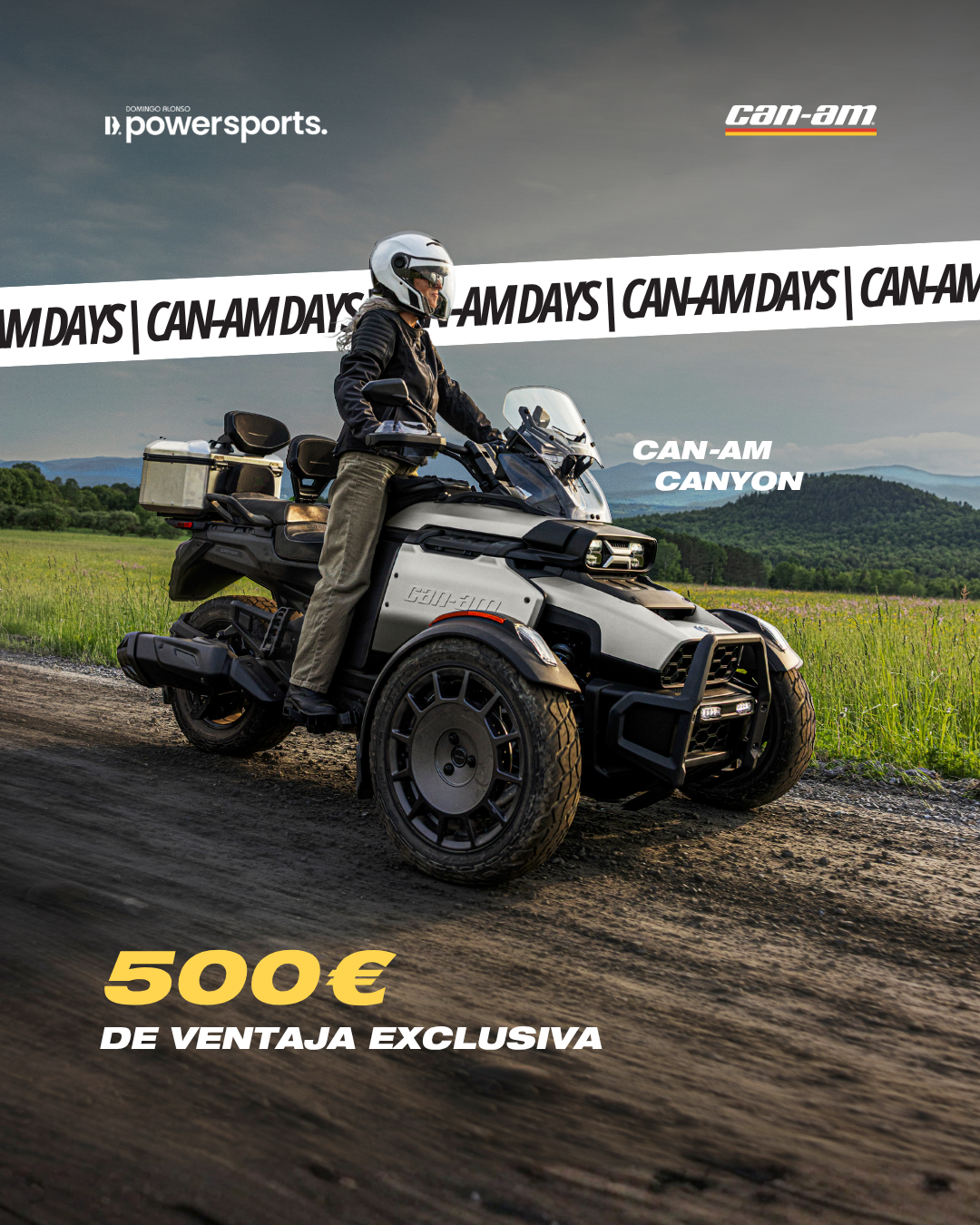 Durante el mes de abril, en Domingo Alonso Powersports podrás aprovechar los Can-Am Days 2026, una campaña exclusiva con 500€ de descuento directo en todos los vehículos Can-Am, tanto On-Road como Off-Road.